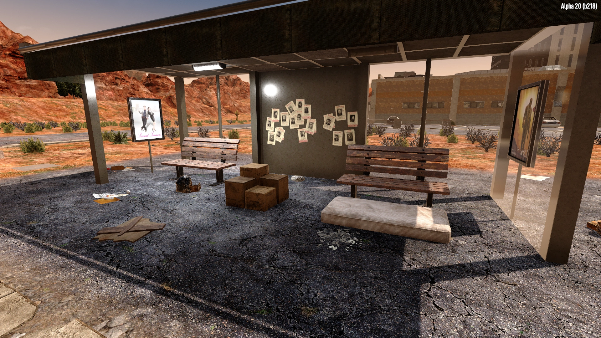 The Bus Stop or bus_stop_01 can be found in two locations in Navezgane. There are no other versions of this location. This location has another Point of Interest directly located in front of the Bus Stop and it was called Bus Wreck.