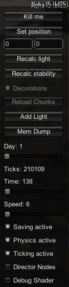 The Debug Mode, or Debug Menu, is an additional set of advanced interface and keyboard commands. It is immediately identified by the menu to the right when the player taps the ESC key, but there are several other menus that make up the entire mode.