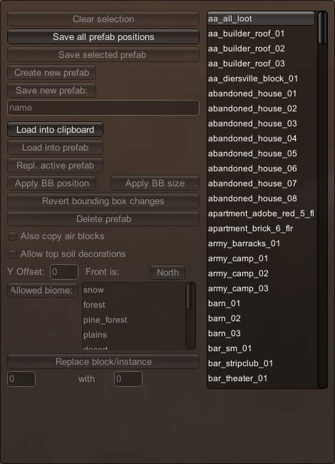 - K: Information on this is sparse. The "DynamicPrefabs" option appears to be the "Prefab Menu" and allows prefabs to be spawned in-game but only when the menu's functionality is "unlocked" using a third party tool (See https://7daystodie.com/forums/showthread.php?47459-Unlocking-In-Game-Prefab-Editor-(Terrain-Tools)-dll-mod), which also unlocks usage of the J, L, and Z keys to define selections.