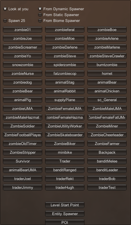 - F6: Entity Menu. Shows a list of spawnable entities (zombies, traders, etc.). Careful - some entities can't be killed (TraderTest) and the Entity Spawners will stay in your map forever.