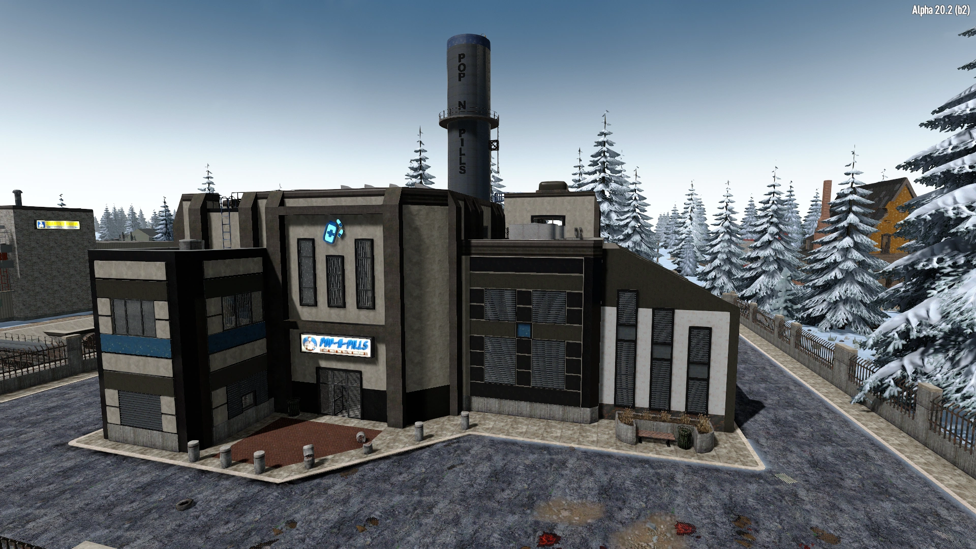 The Pop-N-Pills Factory or factory_03 is a very large factory where Pop-N-Pills product were processed. The exterior is a few stories high with one gigantic silo that reads Pop N Pills vertically. The interior scenery consists of a main lobby and some upper floors as well as some lower floors that encompasses approximately the same surface area as the Factory itself.
